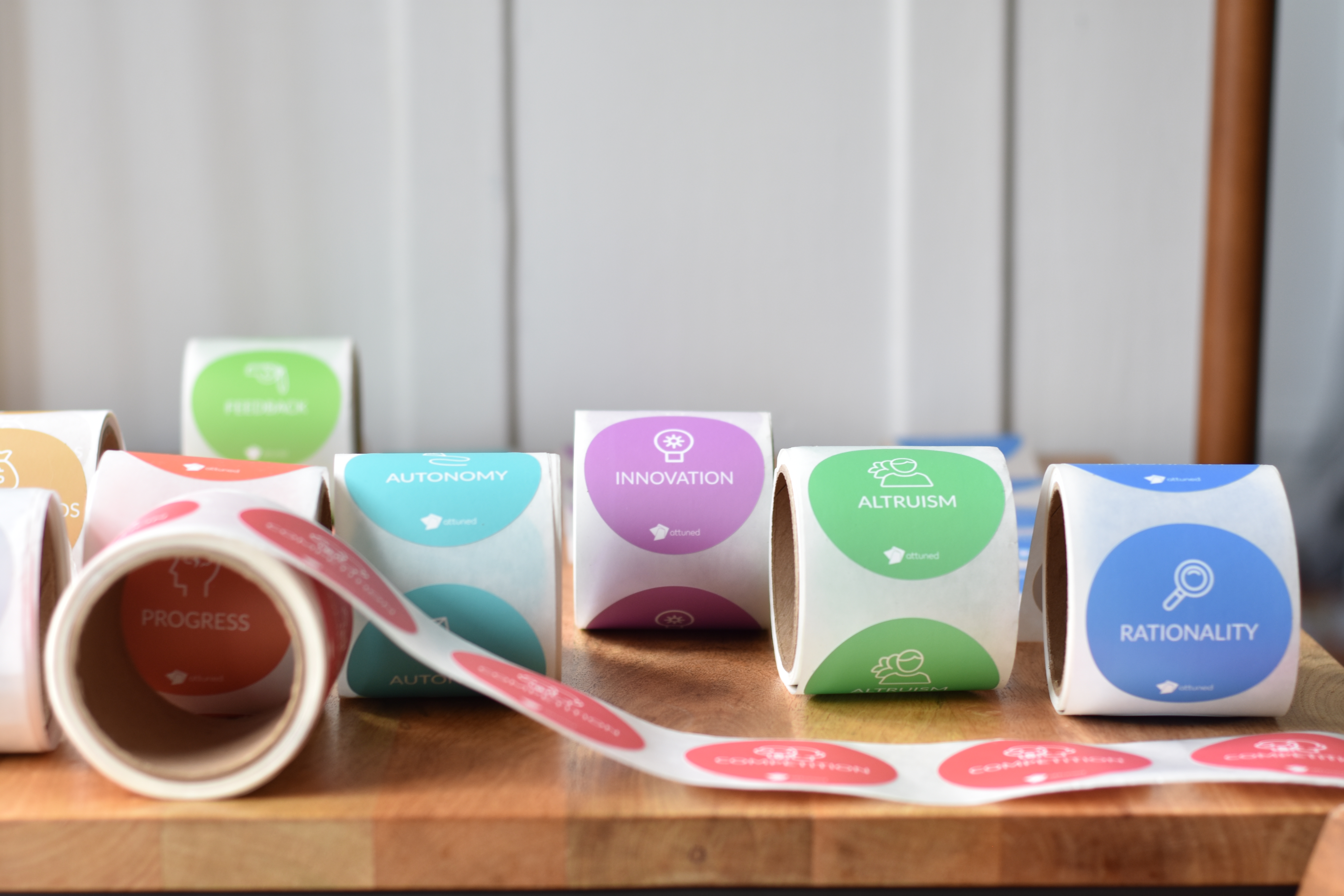 Each employee “advertises” their top three intrinsic motivators on their personalized business card designs.